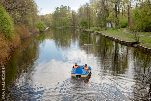 Two People Enjoying a Peaceful Boat Ride on a Serene Lake Surrounded by Lush Greenery in Springtime