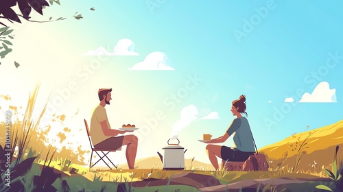 Two people enjoying a serene outdoor picnic with a kettle, under a bright sky.