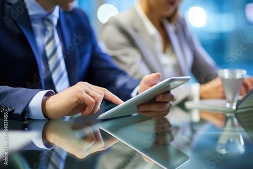 Two people in suits are looking at a tablet. One of them is pointing at something on the screen