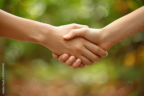 Two people shaking hands in a park, symbolizing partnership and agreement, with a green, blurred background.