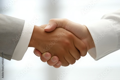 Two people shaking hands. The man is wearing a suit and tie.