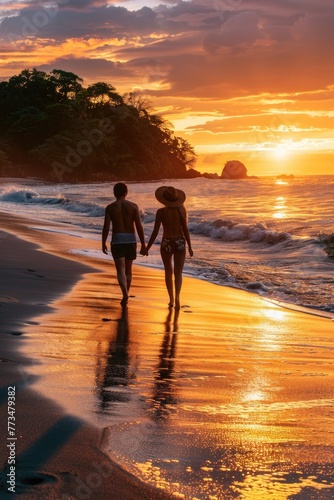 Two people walking on a beach at sunset. Suitable for travel or relaxation concept