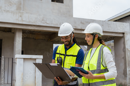 Two people wearing safety gear and looking at a clipboard. One of them is smiling. They are looking at a tablet