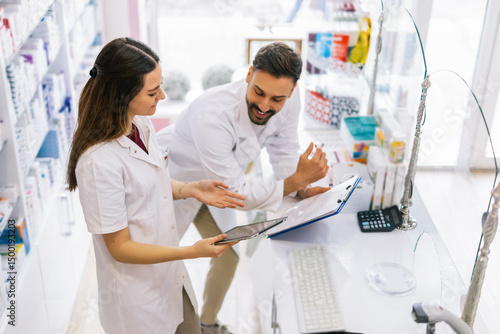 Two Pharmacists Reviewing Tablet and Paperwork at Pharmacy Counter