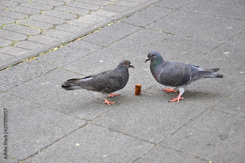 Two pigeons (doves) eating a piece of sausage on the sidewalk