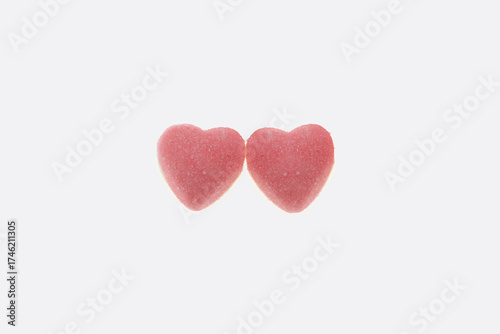 two pink heart candies, sweet candy heart photo, minimal valentine’s day concept, romantic pink candy art, minimalist photo of two pink heart candies placed side by side, isolated on white background