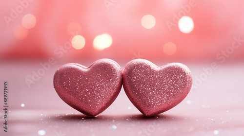 two pink hearts on a pink background with sparkles. Valentine's Day background