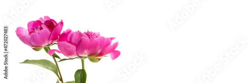 Two pink peonies isolated on white background. Floral wide panoramic banner design