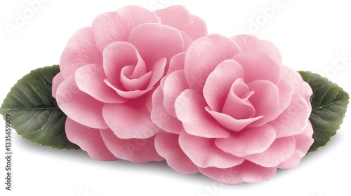 Two pink roses with green leaves.