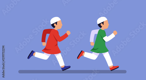 Two Pixelated Men Running Side By Side Wearing Traditional Clothing On Blue Background