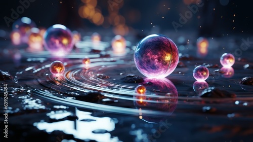 Two planets circling around each other in space, in the style of light teal and violet, y2k aesthetic, holographic, rtx on, anime aesthetic, hyper