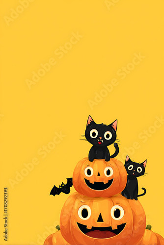 Two playful black cats atop a stack of carved pumpkins against a bright yellow background