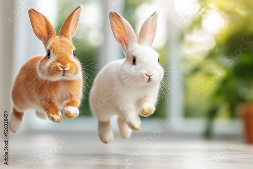 Two playful rabbits leap joyfully indoors, capturing the essence of companionship and movement in a cozy environment.