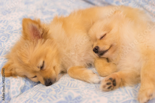 Two pomeranian dogs sleeping together in bed, focus on the right dog