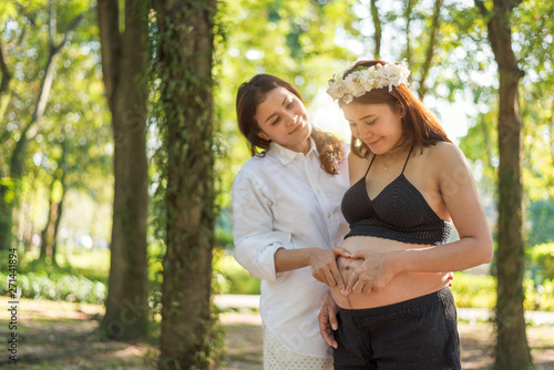 Two pregnant women compare their belly size. Concept photo of pregnancy, pregnant woman, newborn and baby.