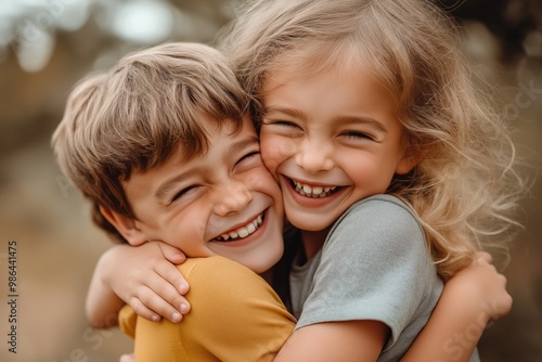 Two pretty laughing caucasian kids kids embracing each other playfully outdoors
