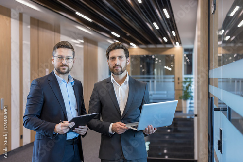 Two professional businessmen holding a clipboard and a laptop, standing in a brightly lit corporate office hallway, looking confidently at the camera, representing teamwork and corporate success