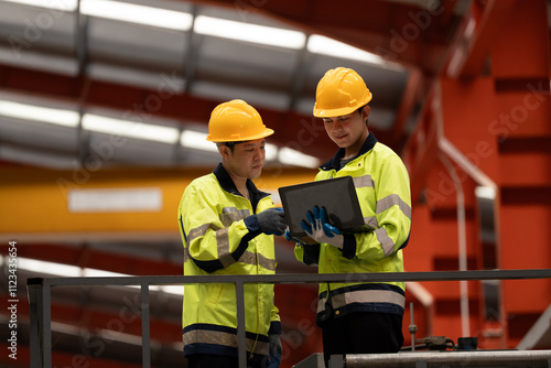 two professional engineer, worker, technician use clipboard discuss work, walk in steel metal manufacture factory plant industry. Asian man and woman wear hard hat check quality machine.