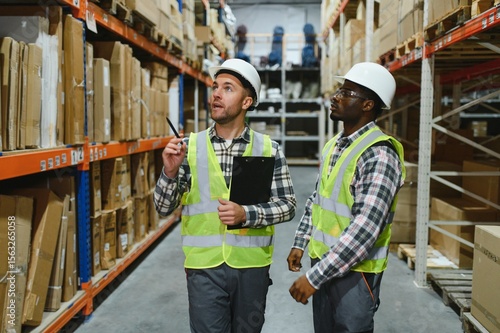 Two professional warehouse workers stand between shelves of products