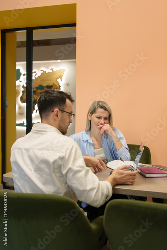 Two professionals collaborating in an office environment, reviewing documents and discussing ideas.