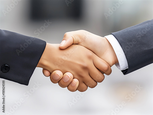 Two professionals shaking hands in a formal business setting, representing partnership, trust, and agreement. Blurred modern office in the background.
