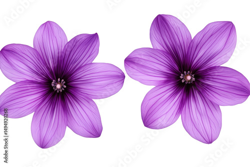 Two purple flowers with five petals each displayed against a black background in a floral arrangement