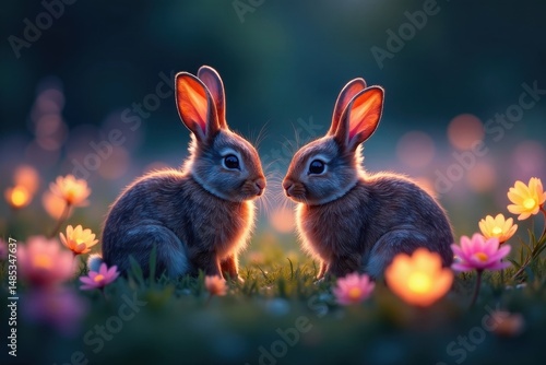 Two rabbits nestled amongst glowing wildflowers in a twilight meadow , spring, nature, image