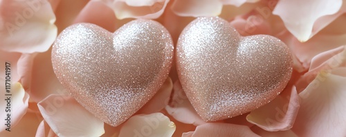 Two radiant hearts with silver glitter accents, surrounded by delicate rose petals, creating a perfect Valentines card design