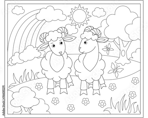 Two Rams of a friend on a meadow against the backdrop of a rainbow and clouds and the sun - a vector linear picture for coloring. Outline. Lovely lambs in the background of the landscape. Trees