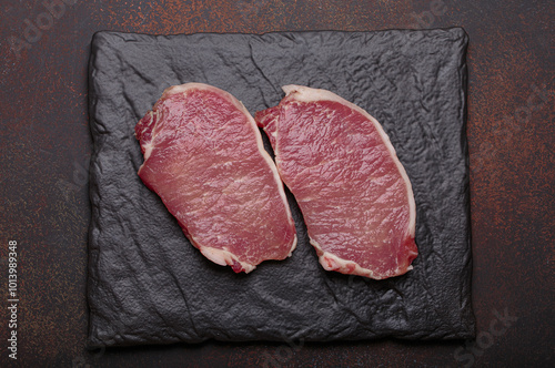 Two raw pork loin steaks on a black slate plate, ready to be seasoned and cooked. Fresh juicy pork meat