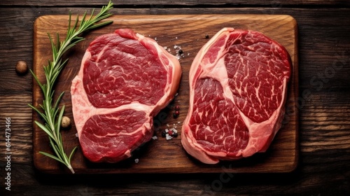 Two raw rib eye steaks on a wooden Board on a table prepared for the grill. Top view rustic style macro lens realistic lighting.