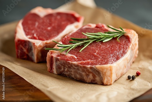 Two raw ribeye steaks with marbling, garnished with fresh rosemary, presented on parchment paper.