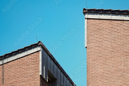 Two red brick walls and roofs meeting under blue sky