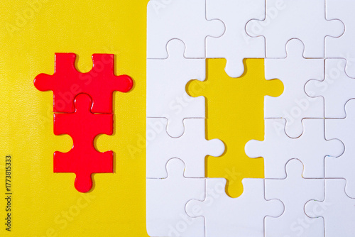 two red elements from jigsaw puzzle and unfinished white jigsaw puzzle on yellow background.