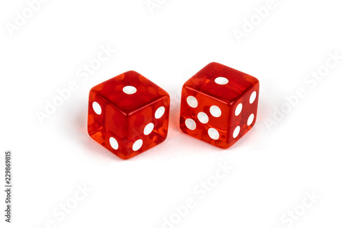 Two red glass dice isolated on white background. One and one