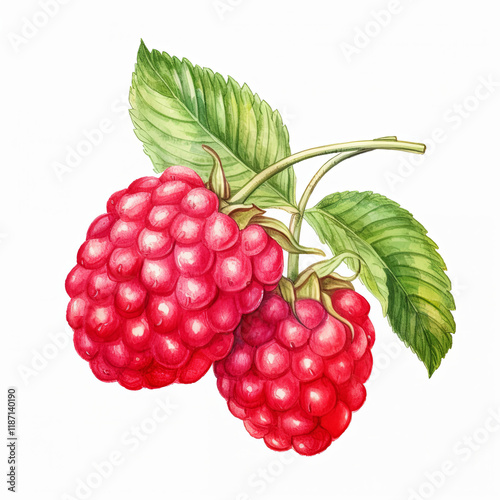 Two red raspberries on a leaf
