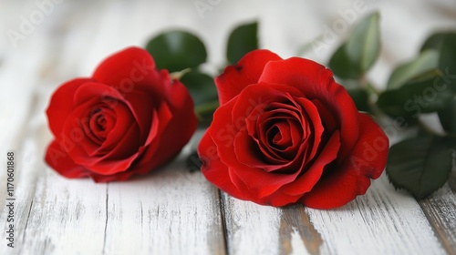 Two red roses on a wooden surface, symbolizing love and beauty.