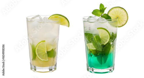 Two refreshing cocktails with lime and ice cubes .ai generative, transparent background, white background. isolated on white background, png, jpeg, jpg.