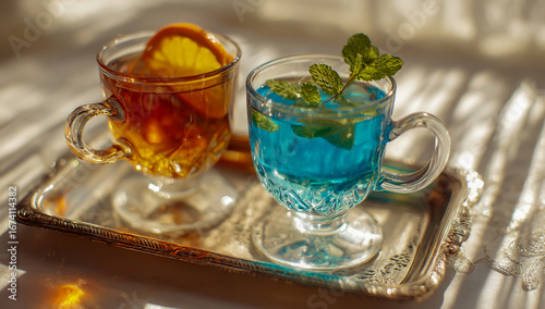 Two refreshing colorful drinks served on a vintage silver tray with sunlight casting beautiful shadows