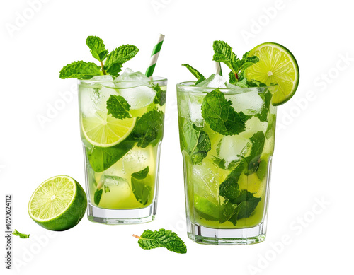 Two refreshing mojitos in glasses, garnished with lime wedges and mint leaves, filled with ice