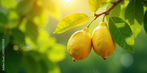 Two ripe lemons hanging from a branch, bathed in sunlight, surrounded by vibrant green foliage
