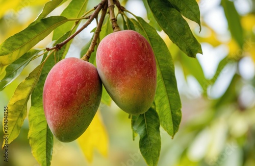 Two ripe mangoes hang from tree branch, vibrant red, green colors. Surrounded by rich green leaves, fruits appear fresh, juicy, ready for harvest. Image evokes tropical sweetness, healthy eating.