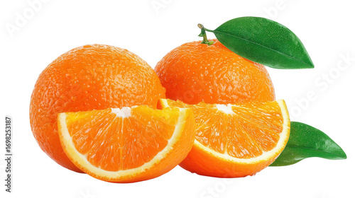 Two Ripe Oranges with Slices and Leaves on Transparent Background