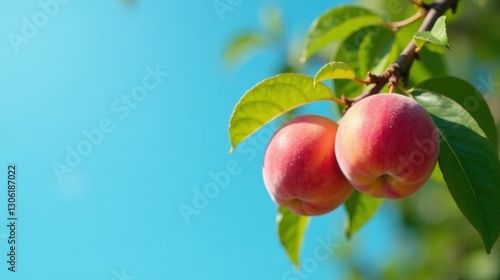 Two ripe peaches hanging from a branch against a vibrant blue sky, showcasing their sun-kissed skin and the lush green foliage of the tree.