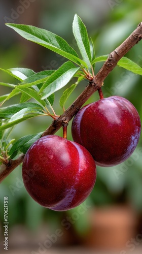 Two round, smooth peaches with vibrant red skin are nestled among green leaves, showcasing their enticing color and freshness