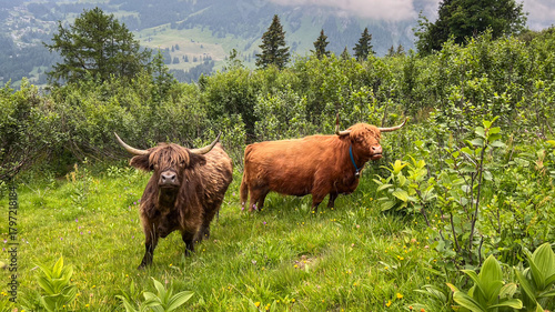Two rugged Highland-style cattle (one dark brown, one red-brown) standing in a green alpine meadow surrounded by lush brush, with mountain slopes and pine trees visible in the soft-focus background.