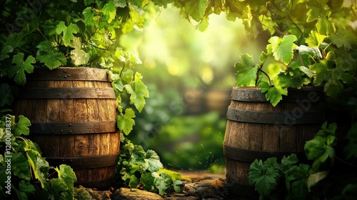 Two rustic wooden barrels nestled amongst lush vineyard foliage, bathed in sunlight.