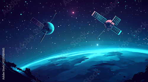 Two satellites orbiting Earth in a starry space scene, showcasing technology and exploration