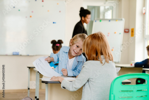 Two school-aged boys sit at the desks in a classroom, smiling and sharing drawings. A Black female teacher stands in the background near a whiteboard, while other students focus on their activities.