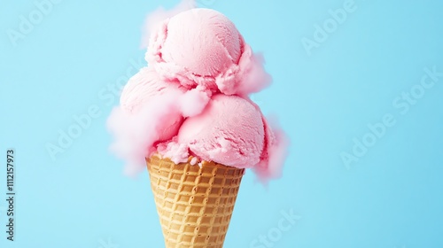 Two scoops of pink ice cream in a waffle cone with a cotton candy cloud on top.